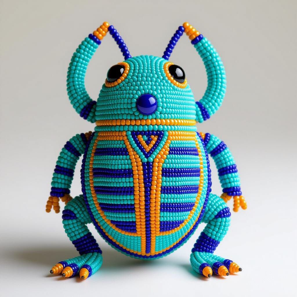 A vibrant Egyptian scarab beetle figurine crafted from turquoise and lapis lazuli beads. The artwork features intricate textures and vibrant colors, in a surreal art style.