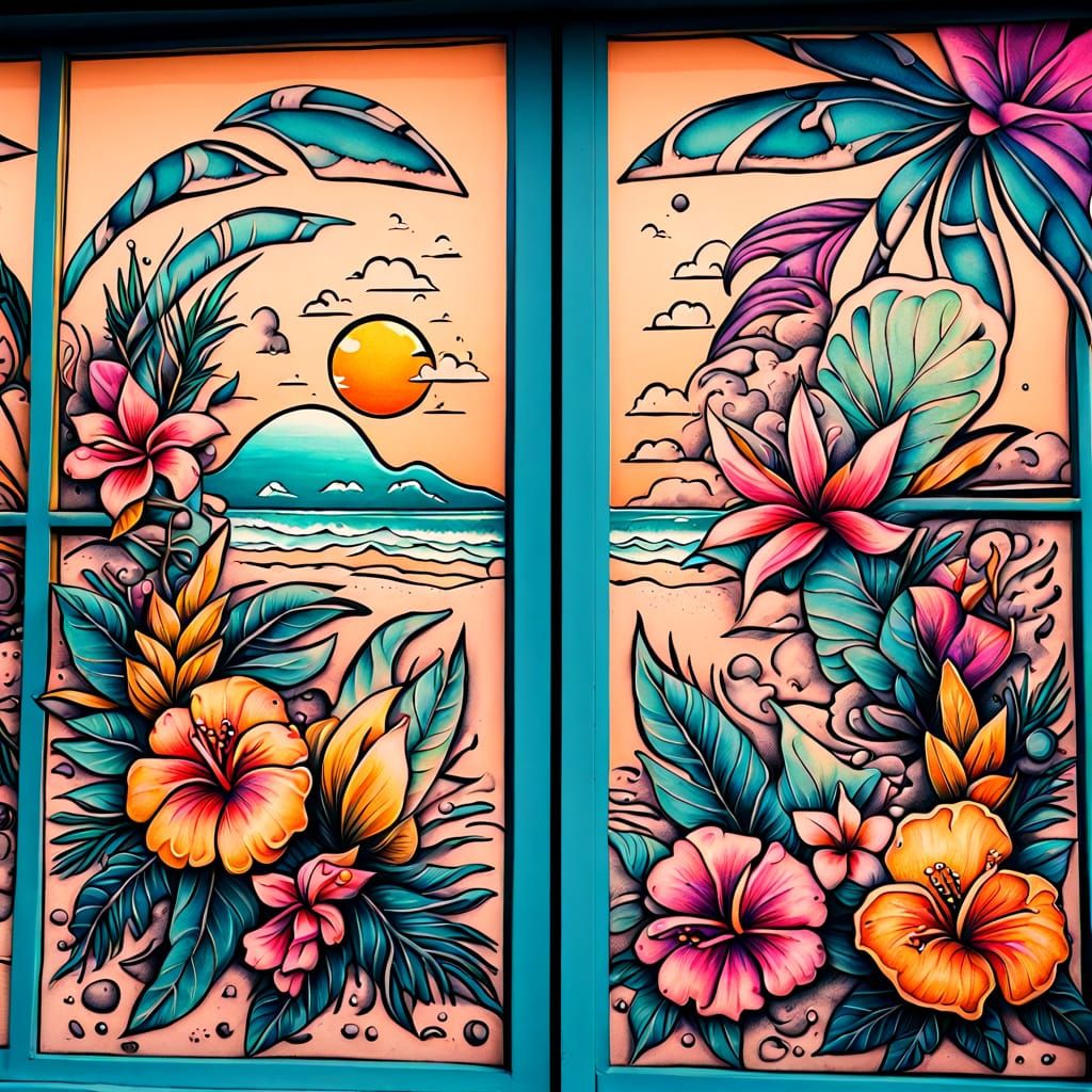 This image shows vibrant tattoo art featuring a beach-themed tattoo flash in a shop window. The colorful seaside motifs and tropical flowers evoke a retro summer atmosphere with pastel colors.