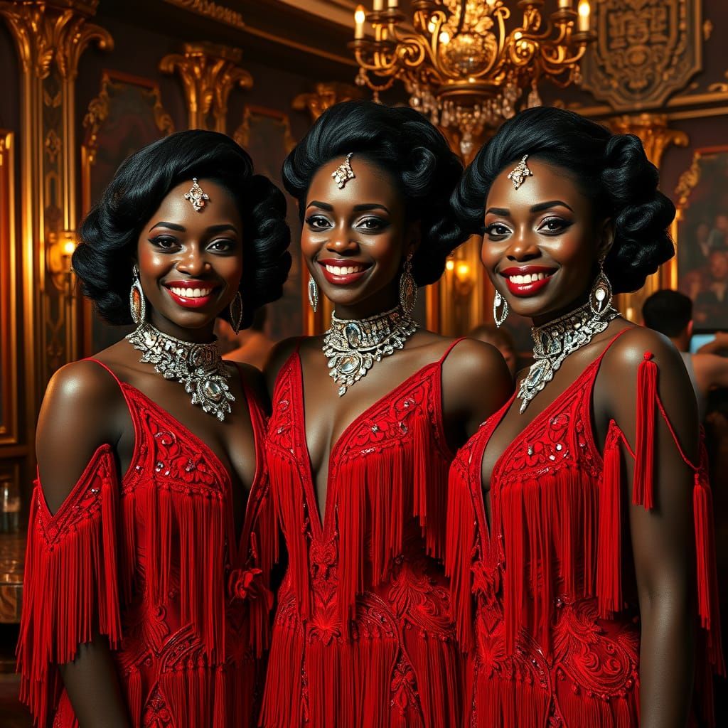 A digital painting showcasing three smiling Black women in red flapper dresses and futuristic jewelry, set in a glamorous 1920s jazz club, with dramatic lighting and intricate details in a digital art style.