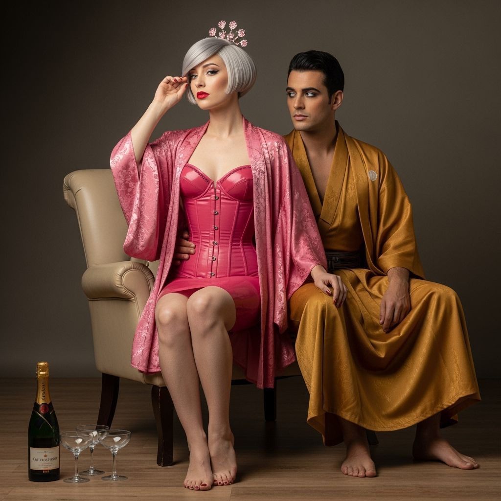 A sensual image of a woman in a pink kimono and corset standing next to a man in a gold kimono. The scene includes champagne and is illuminated with soft lighting, in an art nouveau style.