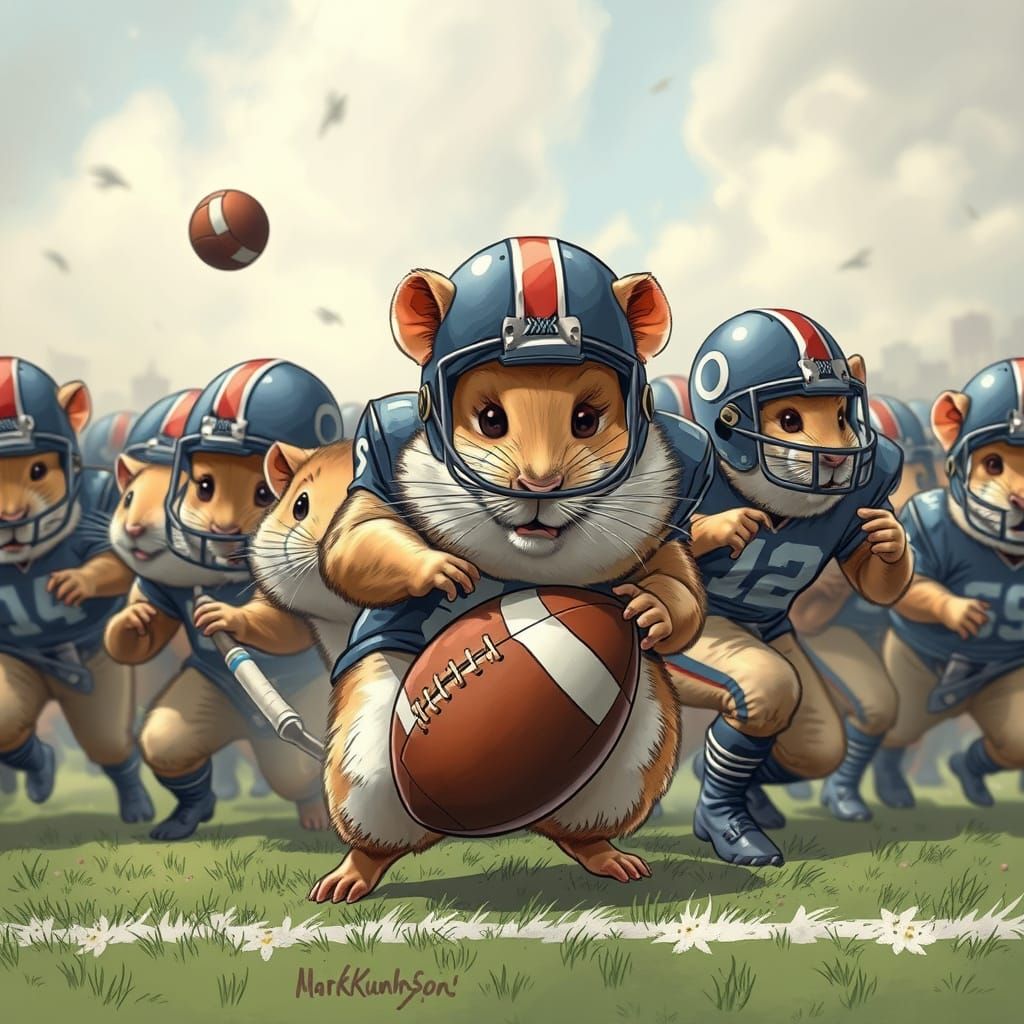 This image shows a thrilling scene of hamsters in action, playing professional football with skill and agility, reminiscent of comic book art's dynamic style.
