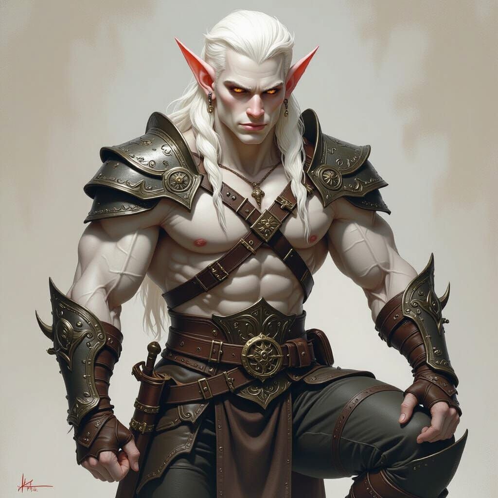 A striking picture of a towering albino elf warrior in detailed leather armor. The image blends dark fantasy with mythical realism, showcasing a style evocative of classic fantasy art.