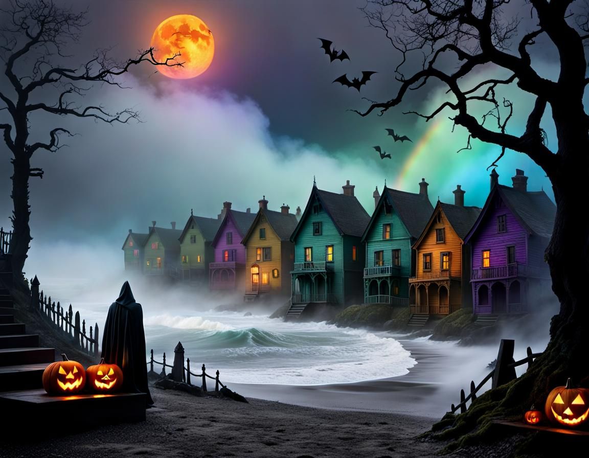 spooky haunted abandoned misty coastal village by assemblage artist "jackal lantern" by sculptor "jackalantern" bats fog mist waves by 3D stumpwork textile artist "fog mist waves" eerie ethereal eldritch bizarre colourful rainbow faux fur throw blanket