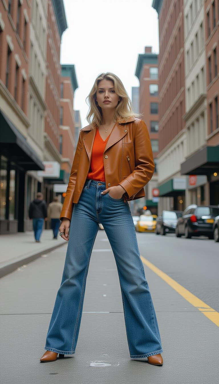 This image shows a young woman in 1970's fashion, posing on a city sidewalk. The low-angle shot with a fish eye lens captures a cinematic aesthetic reminiscent of 35mm film.