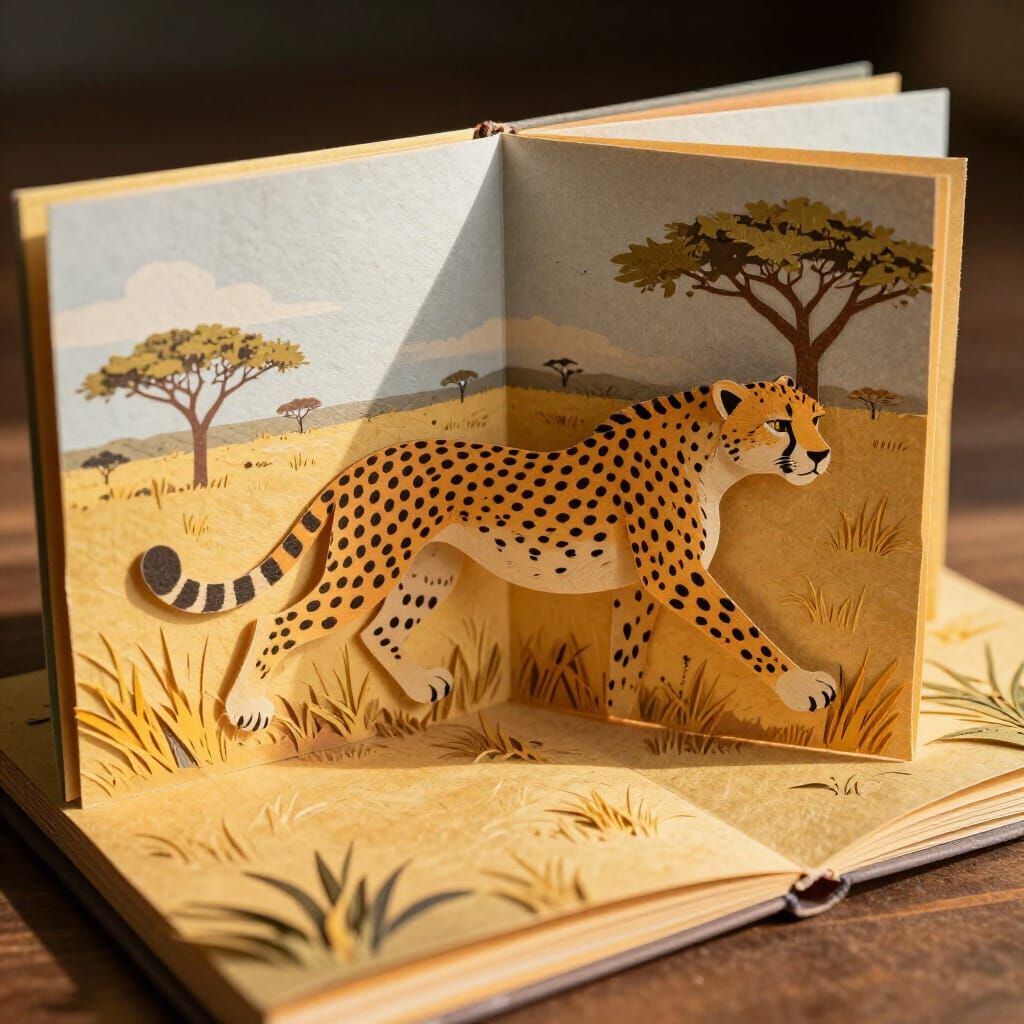 Generate unique popup book images of cheetahs and safari scenes with our easy-to-use AI tool. It's free!