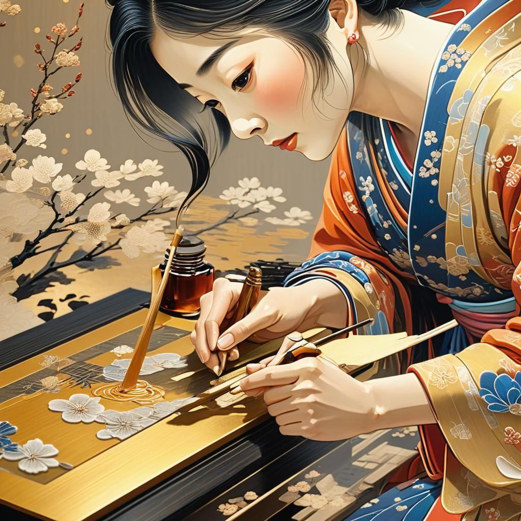 A close-up image of a Japanese woman engraving an ornate panel. The image is reminiscent of traditional Japanese woodblock art, rendered with meticulous detail in soft pastel colors.