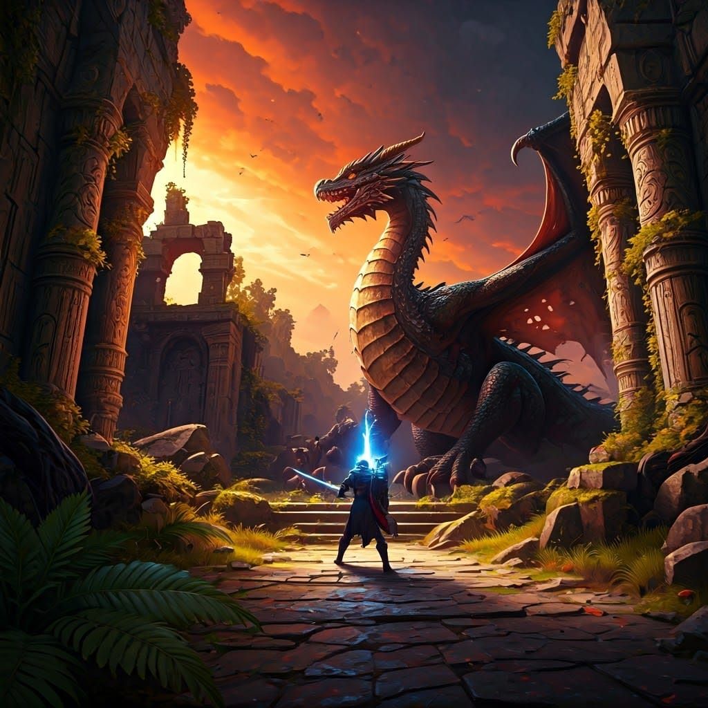 A dramatic image showing a warrior battling a dragon amid ancient ruins. The scene features vibrant foliage, glowing runes, and a fiery sky, rendered as a detailed matte painting with a cinematic color palette.
