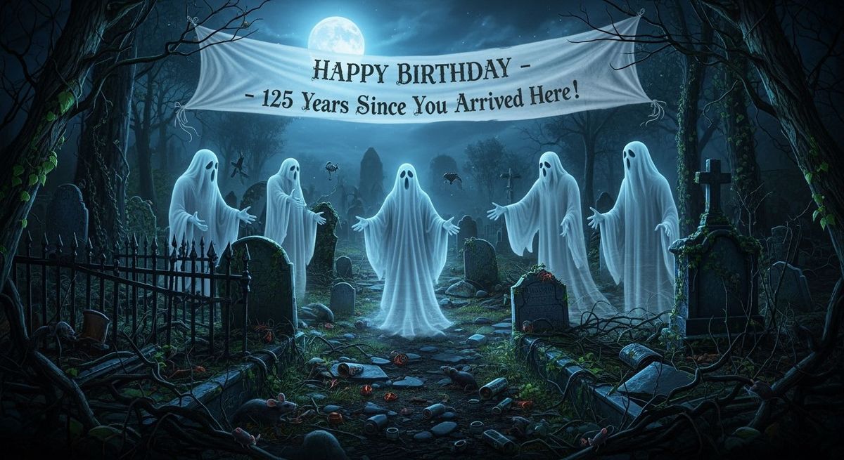 This image depicts a ghostly birthday celebration in an overgrown cemetery under a full moon, featuring spectral apparitions with vibrant blues and purples, captured cinematically.