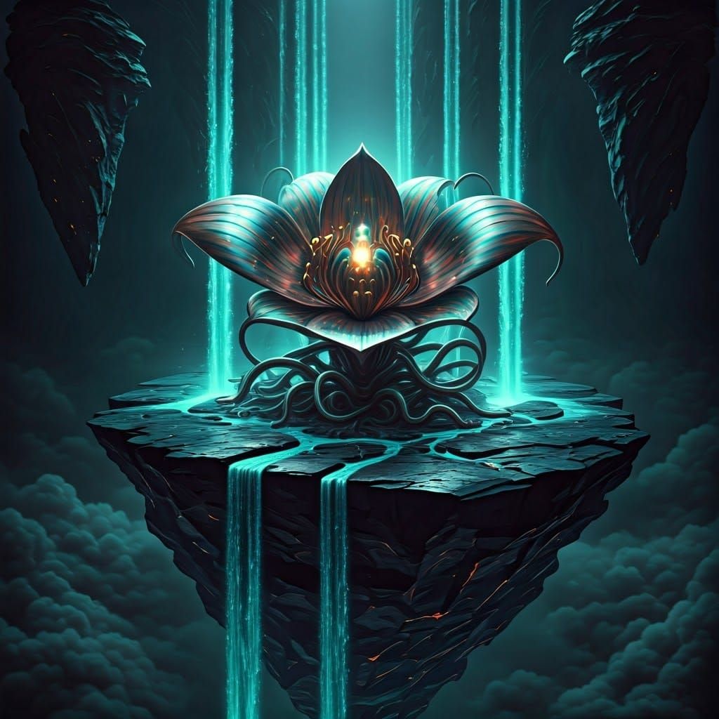 A biomechanical Orchid blooming from the cracked surface of a floating obsidian island, with streams of glowing water flowing upward like in...