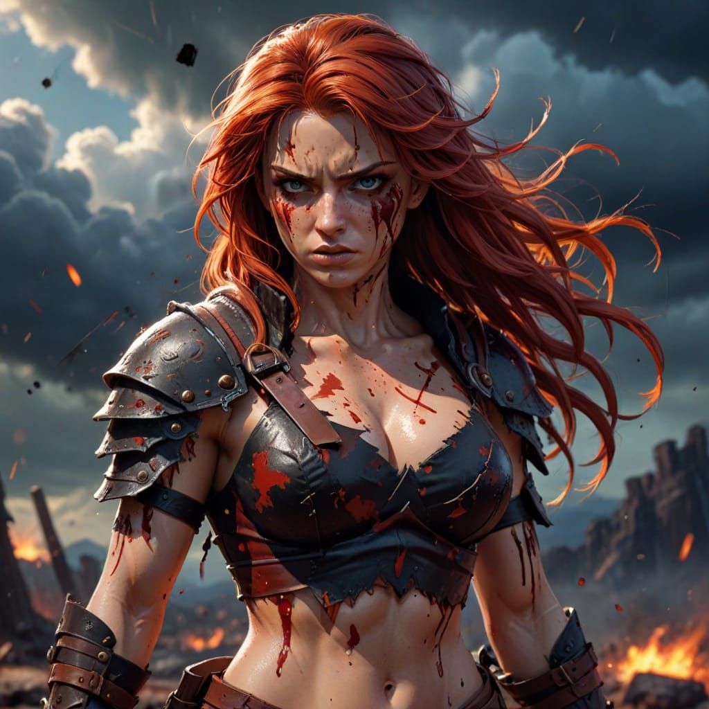 This dynamic anime art features a wounded, blood-covered redhead barbarian woman in torn leather. Intense lighting, vibrant colors, and bold lines highlight the dramatic, dark battlefield scene.