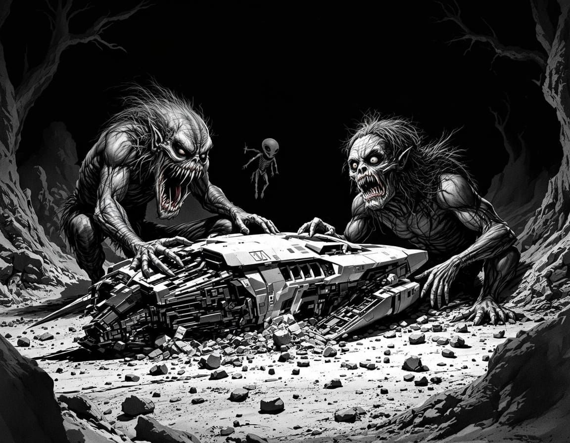 A high-contrast black and white photograph depicts a primitive tribe interacting with a crashed alien spacecraft, rendered in a grotesque caricature style with exaggerated figures.