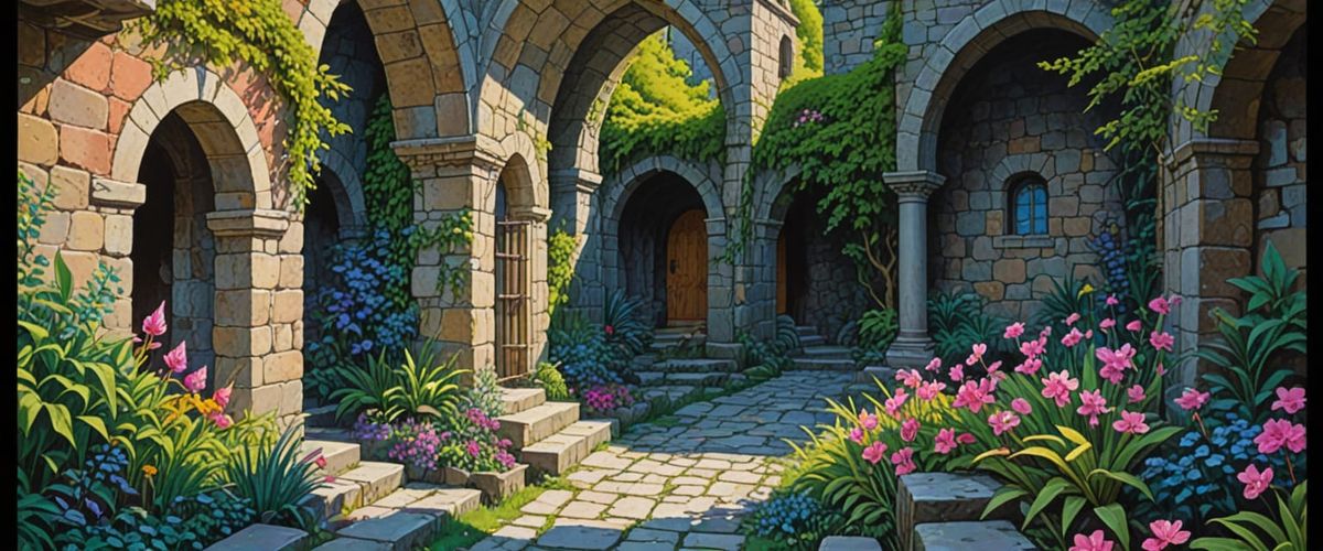 This image shows mysterious stone passageways in a vibrant comic book style. The scene is illuminated by volumetric lighting and features a mossy green and magenta color palette with geometric patterns.