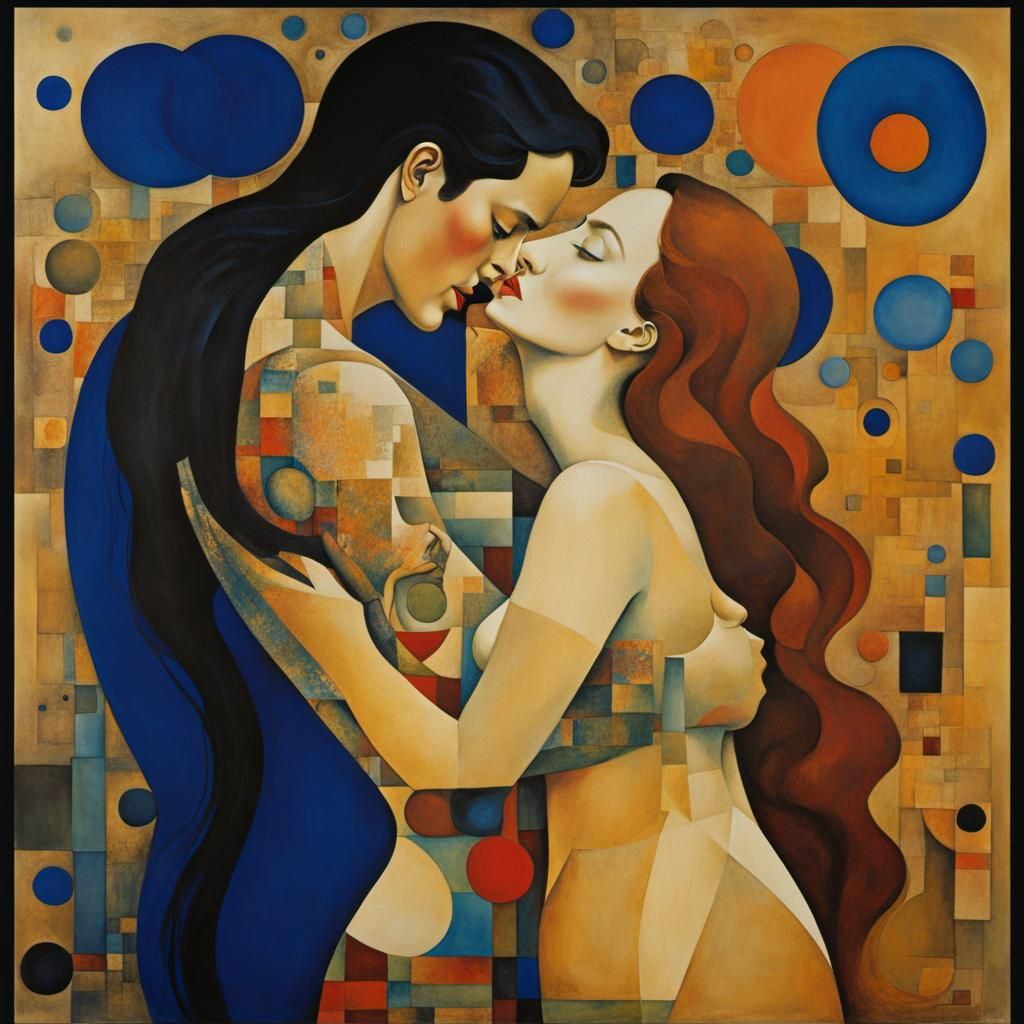 A surreal fine art image depicting new love and intertwined bodies. The artwork evokes elements of expressionism and neocubism in a Salvador Dali-esque style.