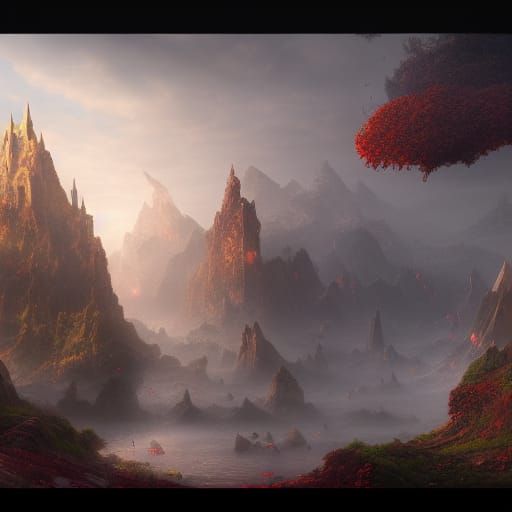 This image shows a detailed matte painting featuring deep, rich colors and intricate details. The fantastical scene is rendered in 8k resolution with complementary colors, reminiscent of fantasy concept art.