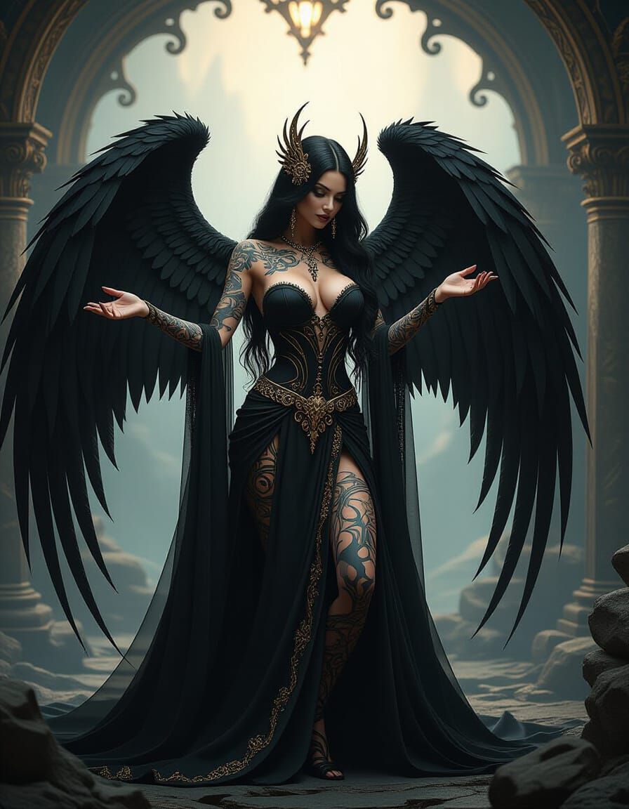 This image showcases a heavily tattooed siren queen in dark, luxurious attire, bowing in a detailed underworld setting. It features high-contrast lighting and a black and gold palette.