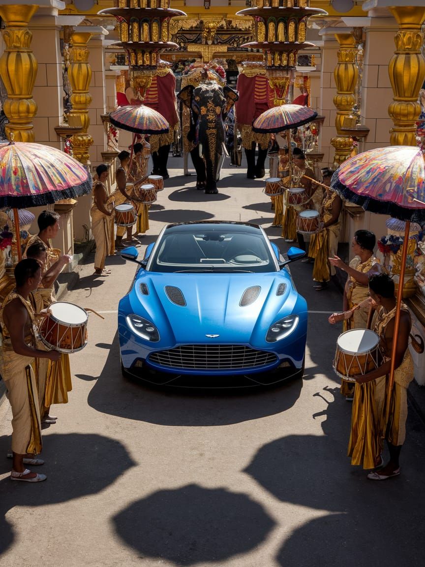 This image showcases an Aston Martin amidst the vibrant Sri Lankan Kandyan festival. Golden ornaments, drummers, ceremonial umbrellas, and decorated elephants create a cinematic and luxurious scene.