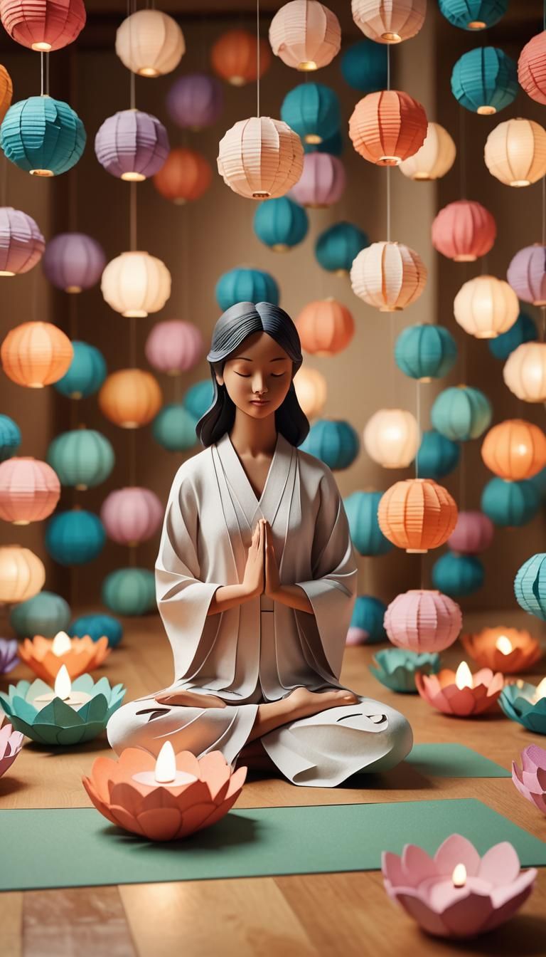 This image shows a paper woman in a yoga pose in a stationery room. The vibrant papercraft uses soft pastel colors, intricate paper textures, and delicate creases to create a serene atmosphere.