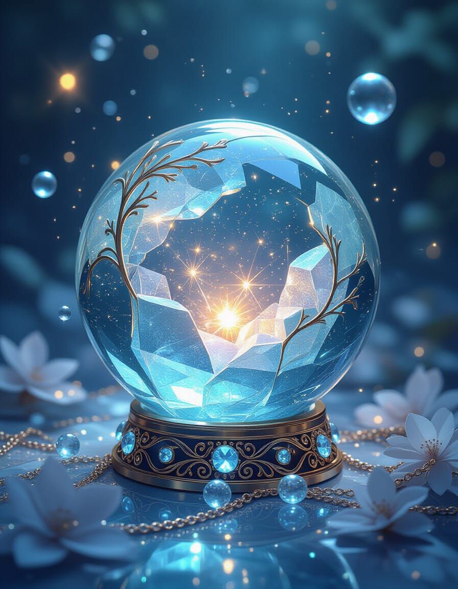 This digital painting features a glowing aquamarine sphere with crushed marbles and cracked bubbles. Ethereal lighting and opalescent colors create a magical, Art Nouveau-inspired fantasy scene with intricate details.