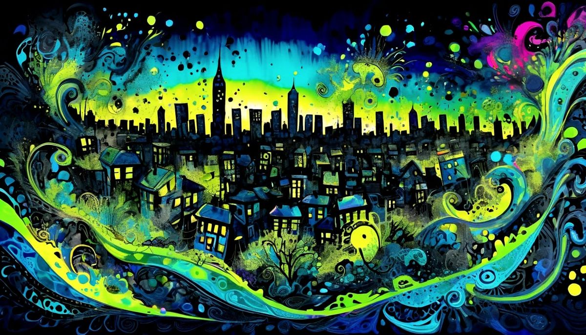 This image showcases a highly detailed, 3D ink-splashed cityscape inspired by Zentangle patterns and UV blacklight art. The vibrant, psychedelic colors create a unique visual experience.
