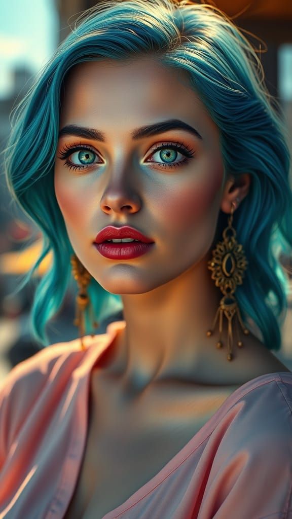 This image is a stunning hyperrealistic portrait of a woman, set against a blurred cityscape with warm and cool tones. Her vibrant cyan hair, green eyes, and soft pink lips are captured in intricate detail, with subtle shading and detailed texture, in a style reminiscent of impressionist influences and d...