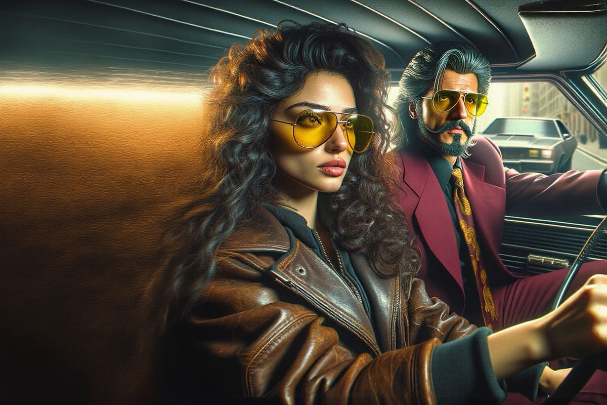 This image shows a Hispanic woman driving a cyberpunk van, wearing aviator sunglasses and a leather jacket. A Tommy Chong look-alike in a red suit sits beside her, racing down a cyberpunk street. The cinematic scene is rendered with 35mm film grain and dramatic lighting.