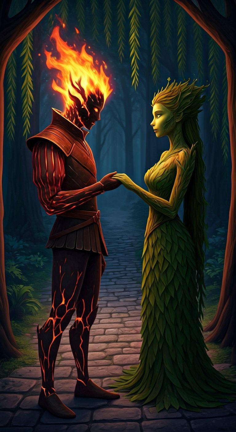 A modern animation style image of a fire elemental Romeo and a dryad Juliet holding hands on a medieval cobblestone path bordering a forest.