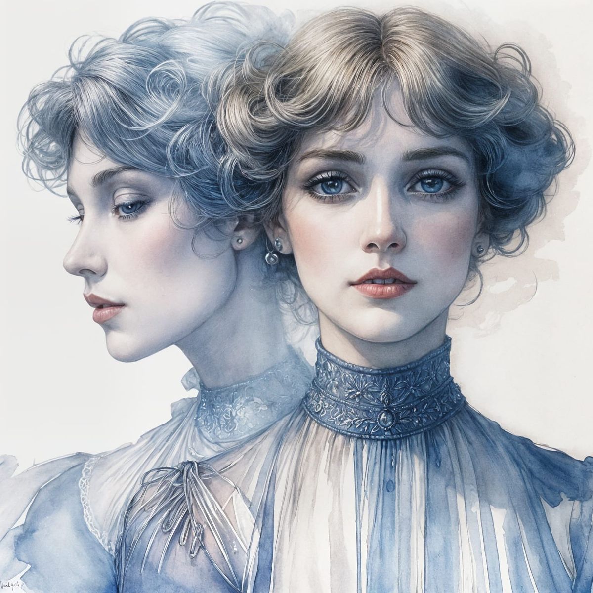 A delicate watercolor painting of a woman in the style of early 20th-century portraiture. The artwork uses soft blue and white gradients to create a subdued, ethereal aesthetic.