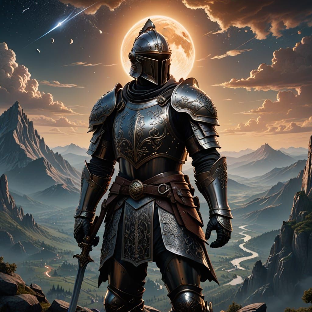This image showcases a knight in ornate, rune-etched armor on a mountaintop, observing a vast, star-filled sky. Rendered as a detailed digital painting, it captures a high fantasy atmosphere.