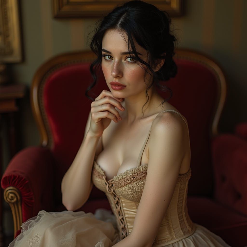 A portrait of a Victorian woman with pale skin and dark hair in a corset, posing in a parlor. The image is reminiscent of art nouveau, with muted colors and detailed textures.