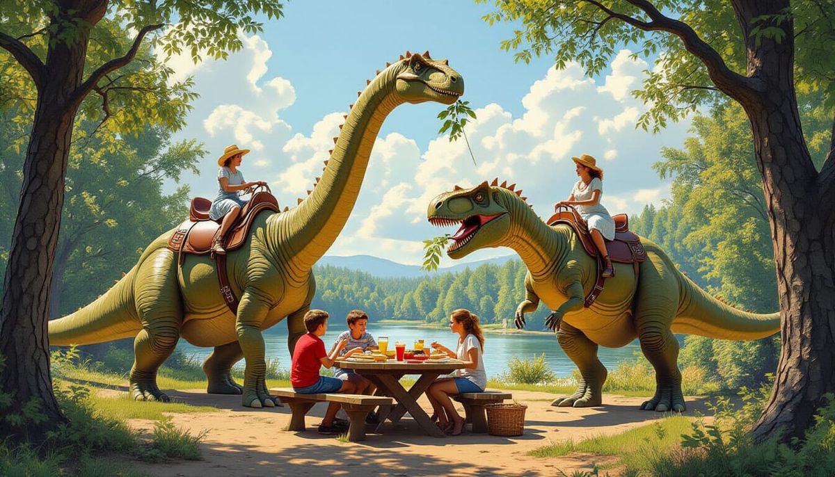 Create your own dinosaur family picnic images with our free and easy AI image generator!