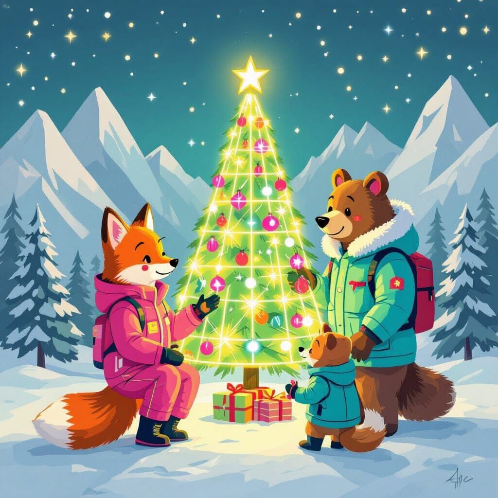 This image shows anthropomorphic animals in vibrant, retro-futuristic winter attire around a luminous holiday tree. Created in a style blending 80s illustration and early digital art, it features playful characters and saturated colors.