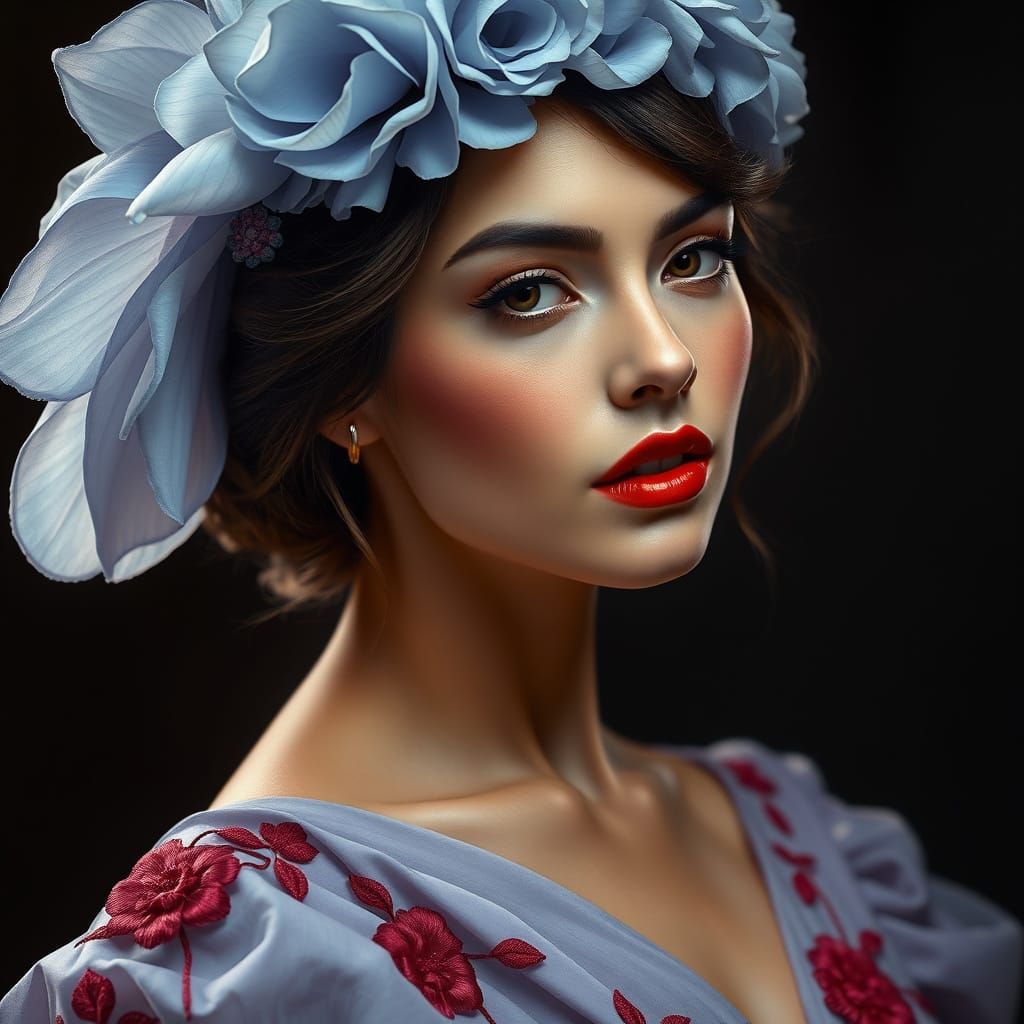 hyperrealistic woman, elegant pose, large light-blue flower crown/headpiece, softly draped, light-purple/lavender gown, intricate floral embroidery of crimson red flowers and greenery, rich lighting, dramatic shadows, dark background, detailed facial features, red lipstick, woman's eyes are looking slightly ...
