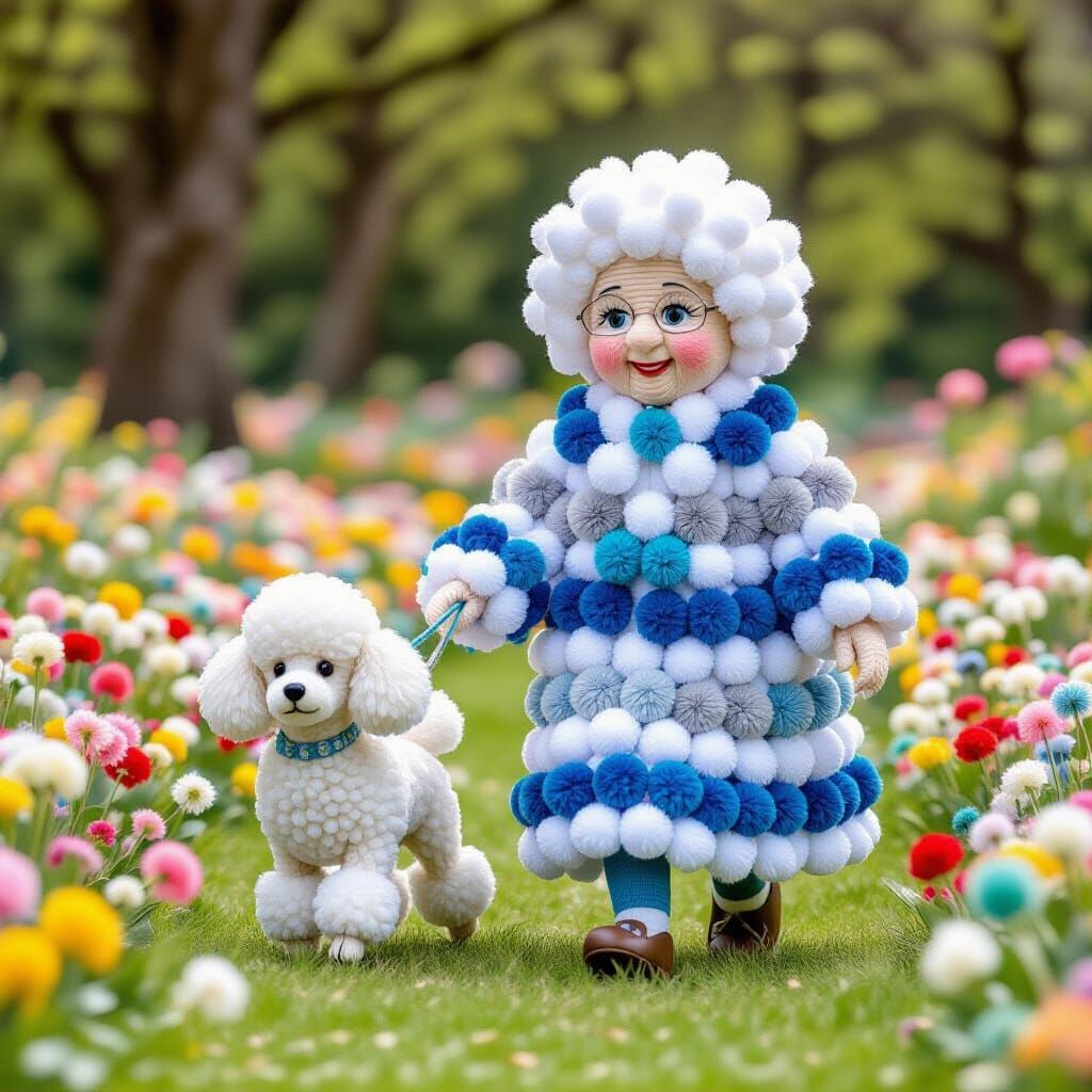 This image shows a grandmother and her poodle, both crafted from pompoms, enjoying a walk in a park. The artwork evokes a whimsical, impressionistic style with soft colors.