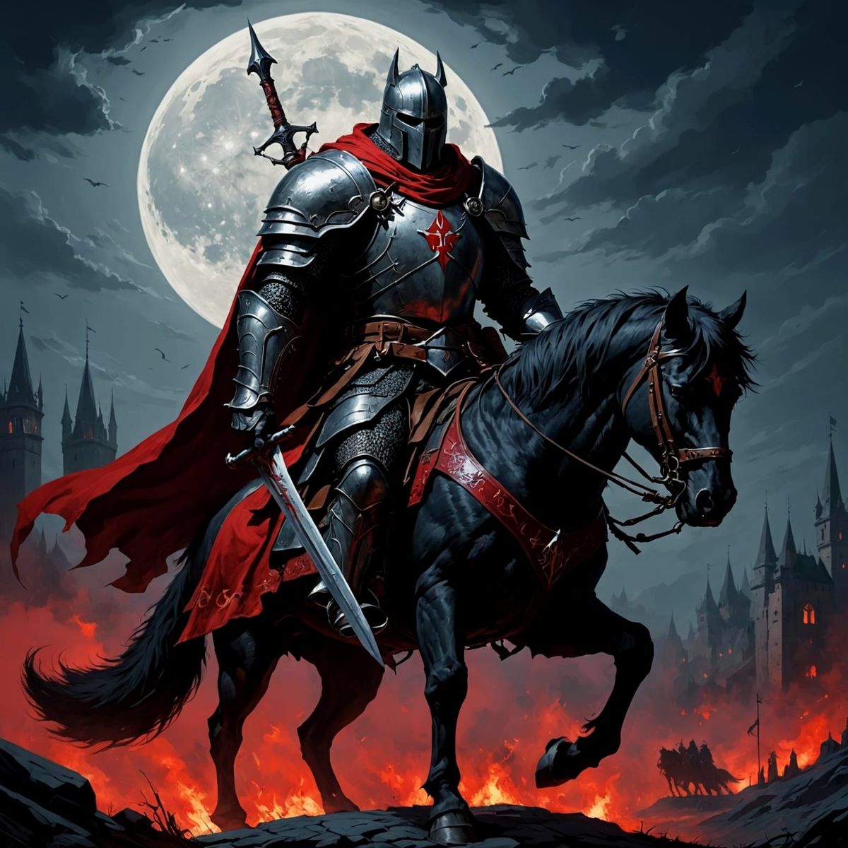 This image shows a heroic werwolf knight illuminated by the light of a full moon, embarking on a never-ending crusade under the crimson banner of his order.