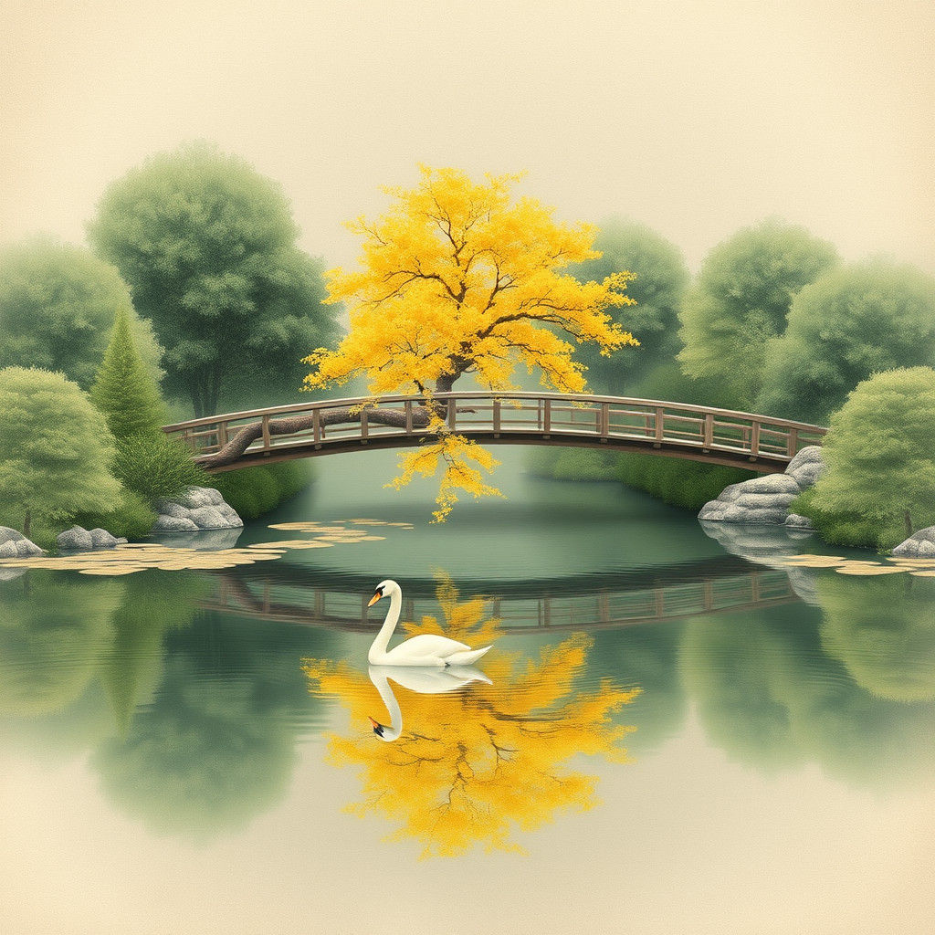 A tranquil pond scene with a swan, bridge, and flowering tree. The image evokes traditional Asian art with muted colors and subtle textures, reminiscent of ukiyo-e prints.