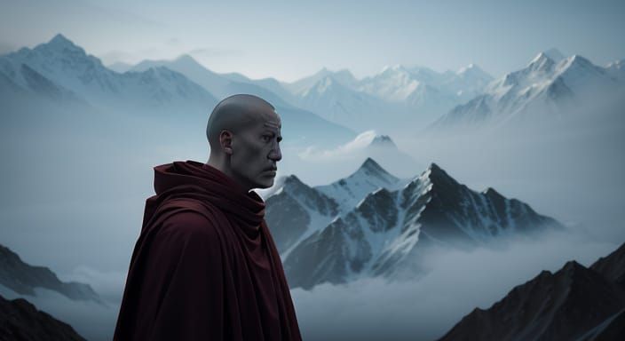 A dramatic image of a ghost monk in the Himalayas. The image is presented as a cinematic film still with atmospheric lighting and a vignette effect.