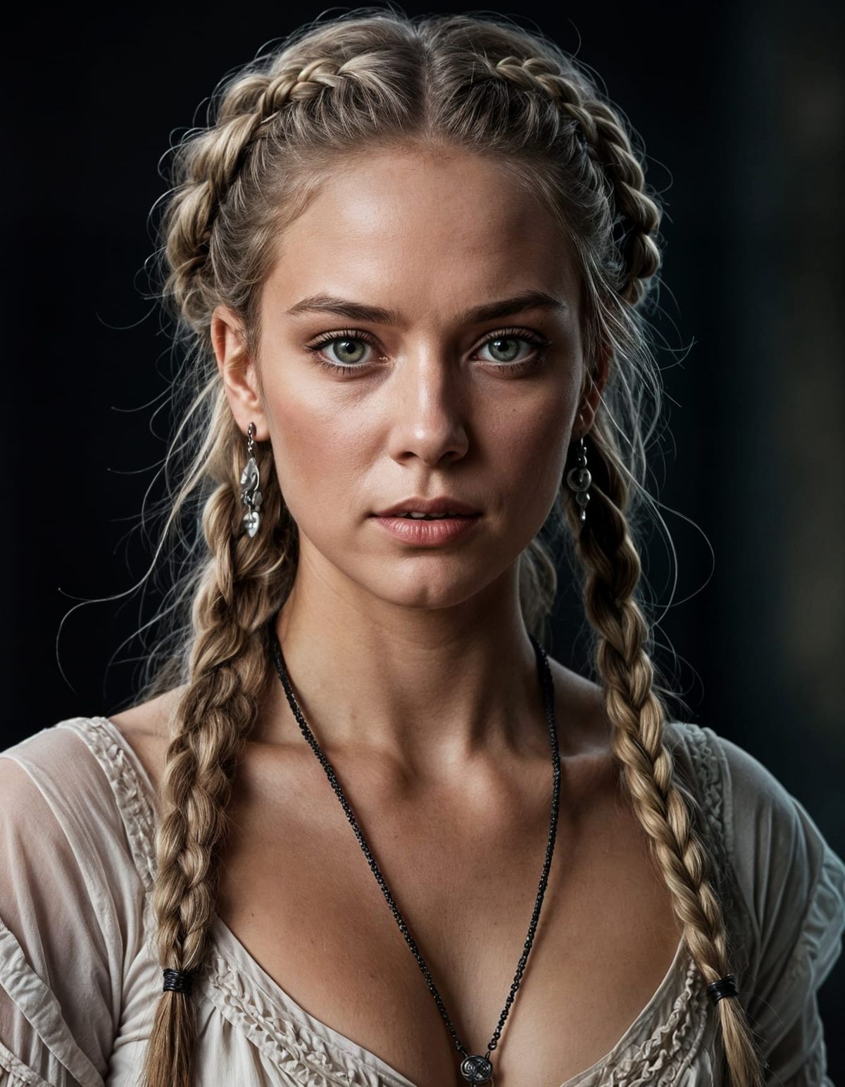 This image shows a stunning, photorealistic portrait of a female pirate with blonde braided dreadlocks, set against a dark background. Soft pastel colors and elegant features create a captivating and refined image, reminiscent of professional editorial photography.