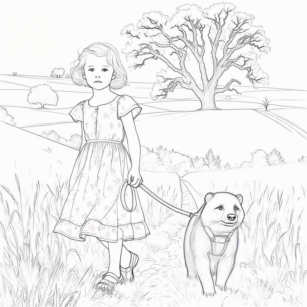 This image depicts a young, slim blonde girl from the 1930s leading a badger on a leash in a rural Kansas setting. The scene captures a charming, vintage moment.