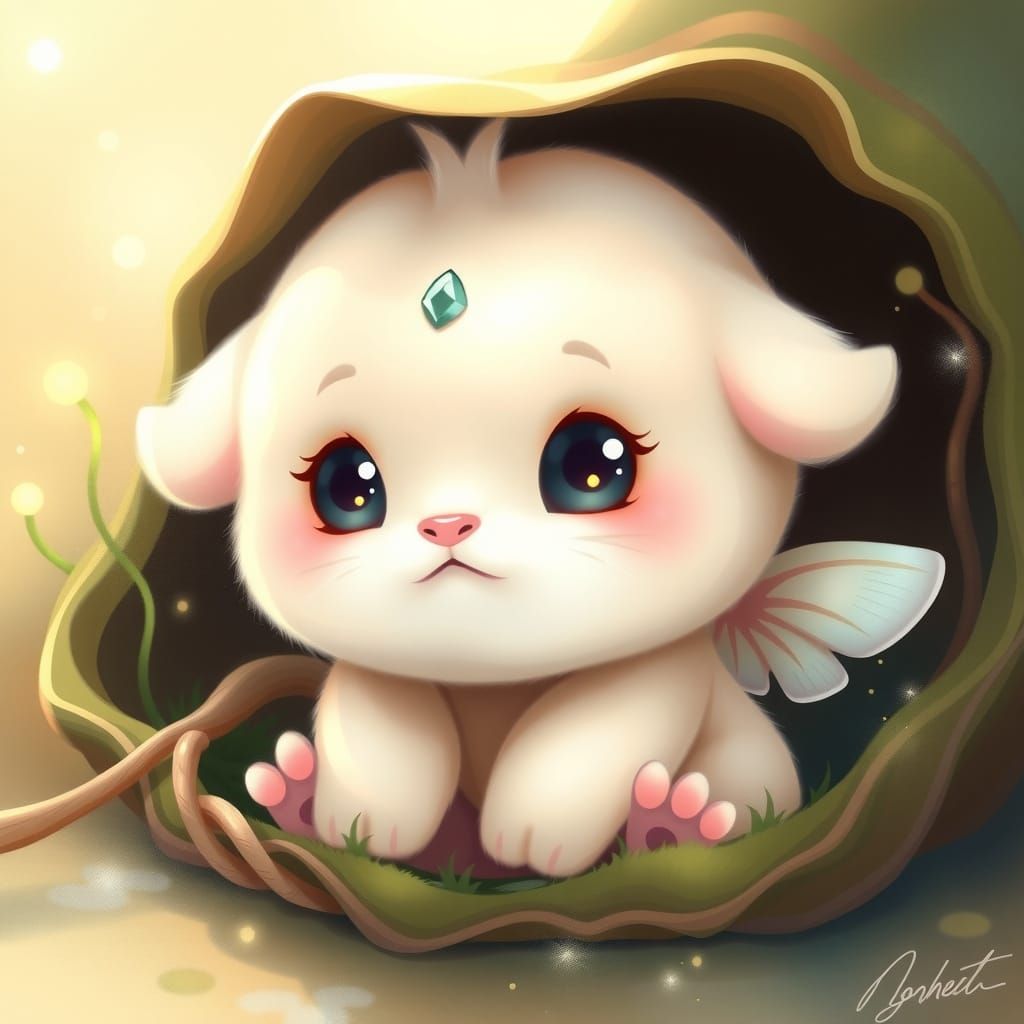 This image shows an unbelievably cute, round, fantasy-inspired kawaii baby animal with soulful eyes and fluffy pastel fur. The creature sits peacefully in a cozy natural setting, surrounded by soft lighting. The artwork is soft, painterly, and dreamy.