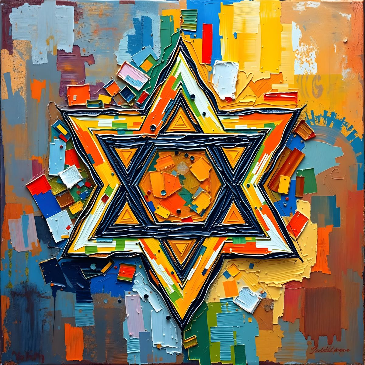 This image shows a vibrant, textured Star of David in a neo-impressionist style, blending expressionist and post-impressionist techniques with thick, layered paint