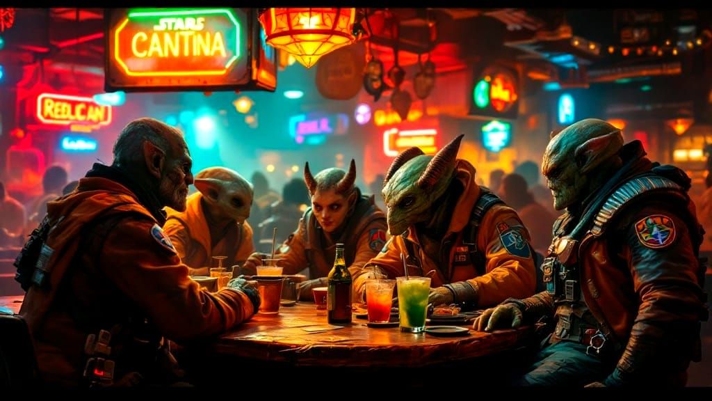 This image captures the bustling atmosphere of the Mos Eisley Cantina, where diverse alien pilots gather at the worn bar, each with their unique attire and stories, set against a dimly lit background of flickering lights and vibrant neon signs.
