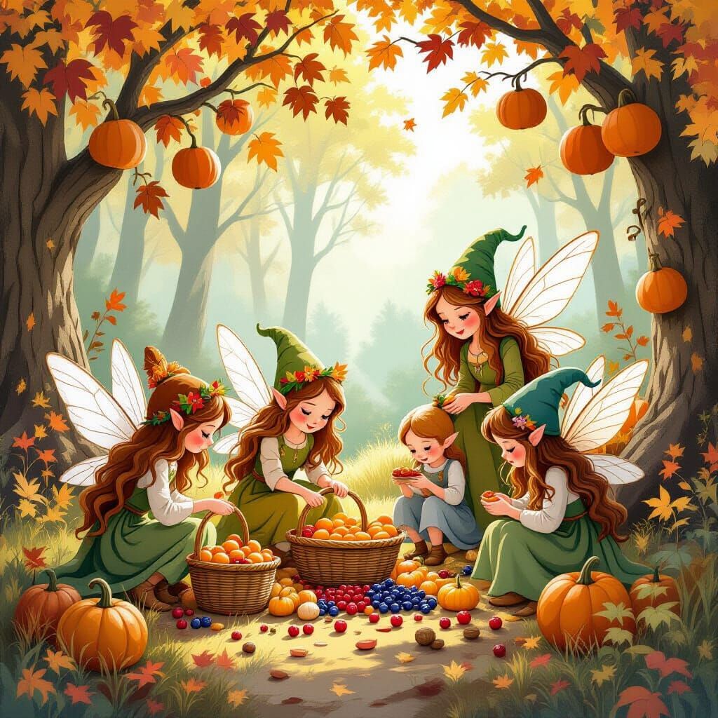 This image depicts woodland fairies with autumn-colored hair gathering nuts and berries for the harvest, overseen by a queen. It features a charming forest setting with vibrant, naturalistic painting.