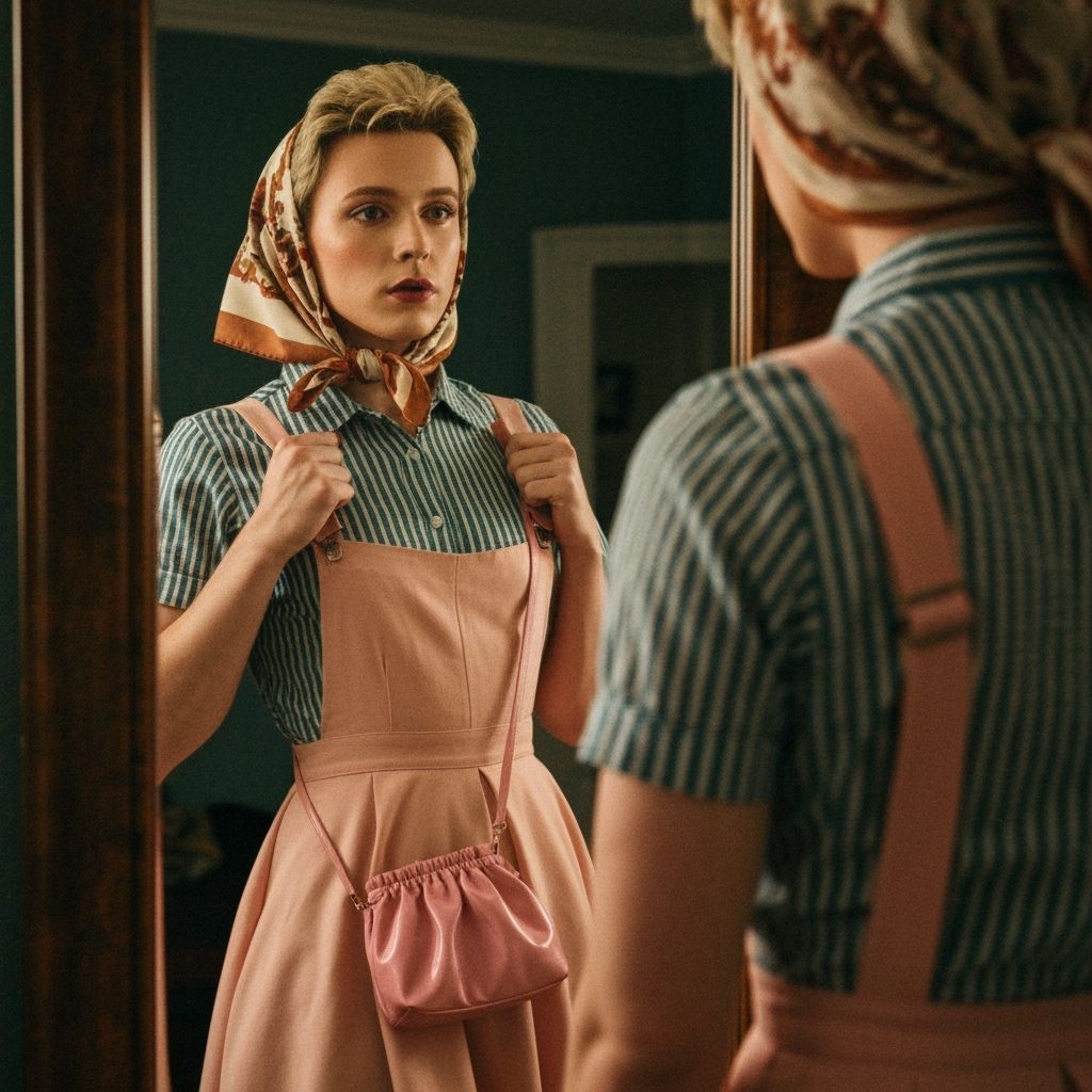 A cinematic film still of a young man in a vintage pinafore dress, with short blond hair and light makeup, looking into a mirror. He holds a pink purse and wears a scarf.
