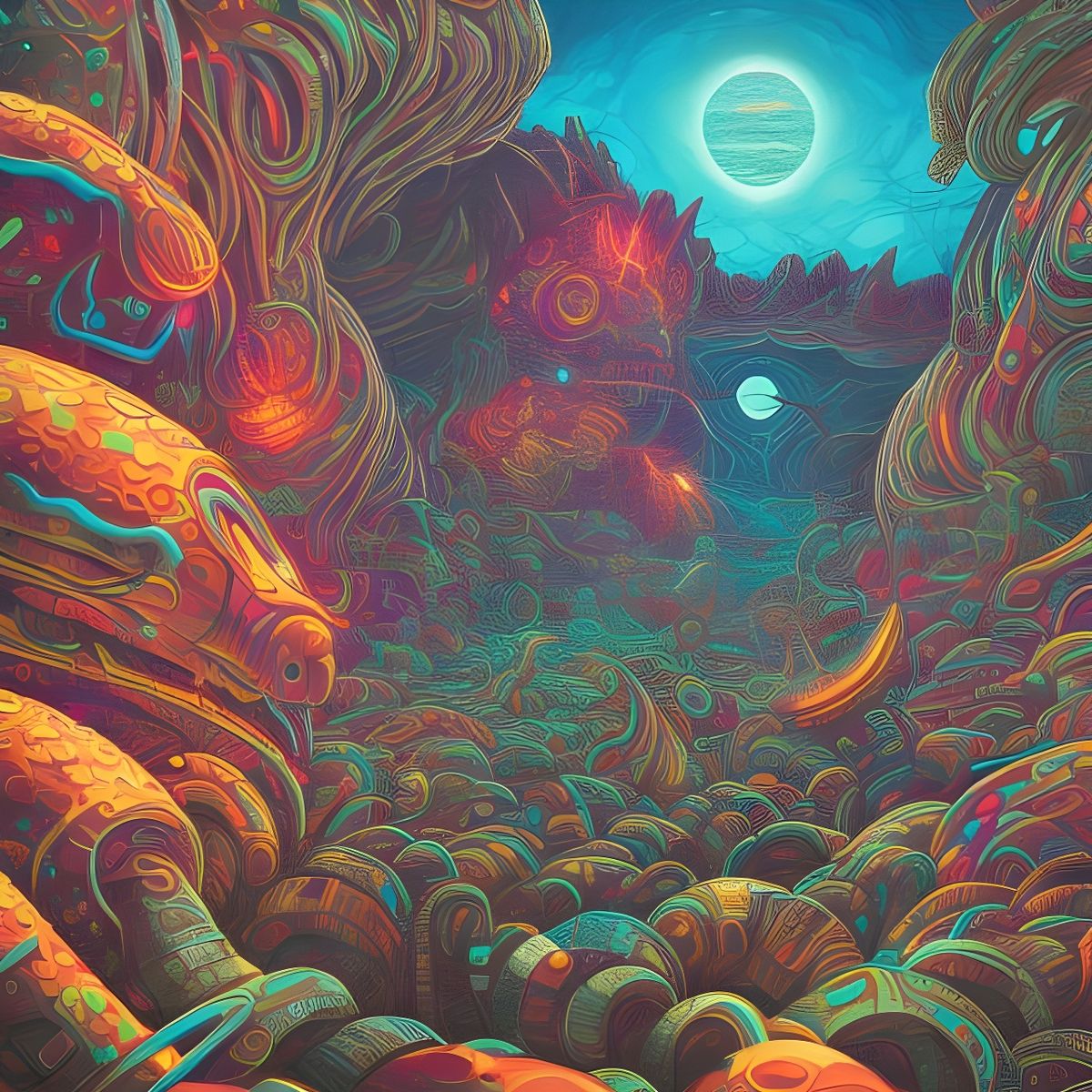 This image shows a gigantic everything bagel floating in space. The bagel is rendered as cyberpunk digital art, with psychedelic colors and maximalist detail.