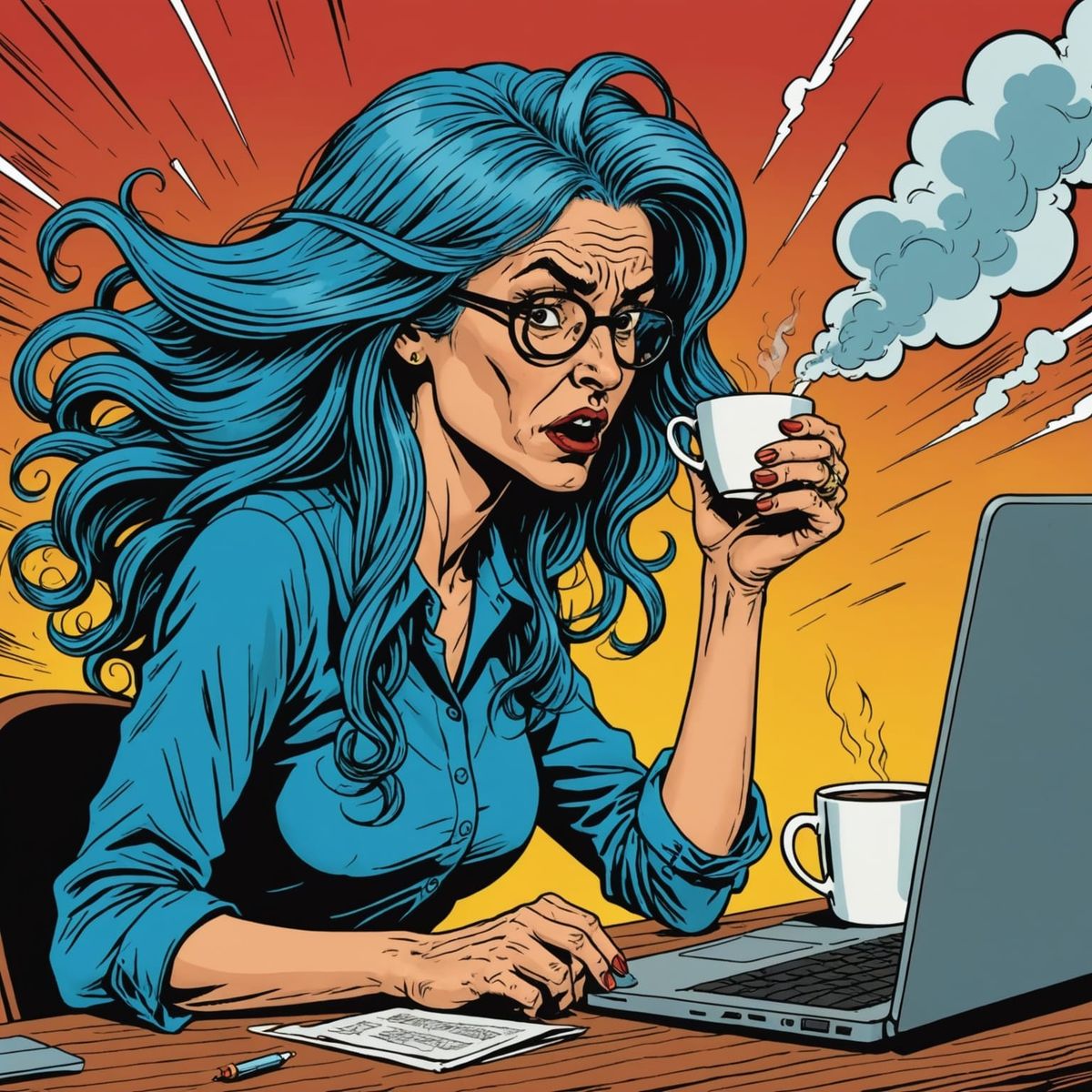 In the style of R. CRUMB, a cartoon woman with long blue hair, violently blown back behind her like she's in a wind storm, sitting at a desk with a laptop on the desk. The woman has a cigarette dangling from her lip, holding a cup of coffee in one hands, and pointing at the laptop screen with her finger. ...