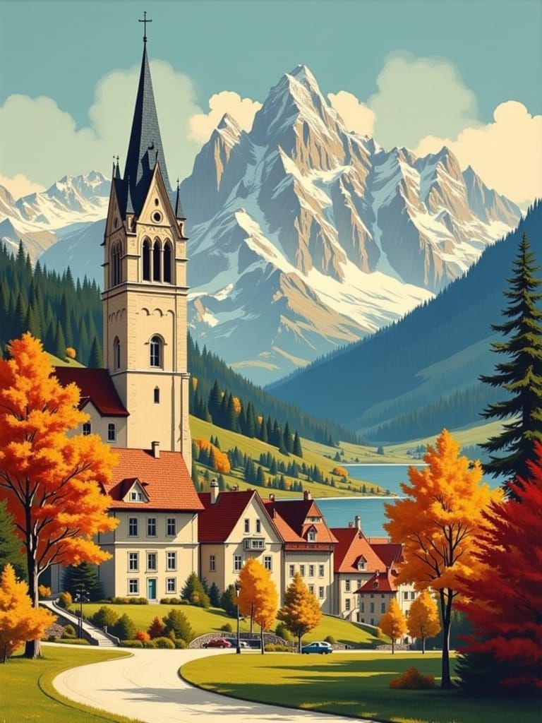 This image captures a picturesque alpine village with a prominent church tower and colorful houses, set against vibrant autumn trees and majestic mountains. Presented in a retro, painterly poster style evoking 1930s European travel.