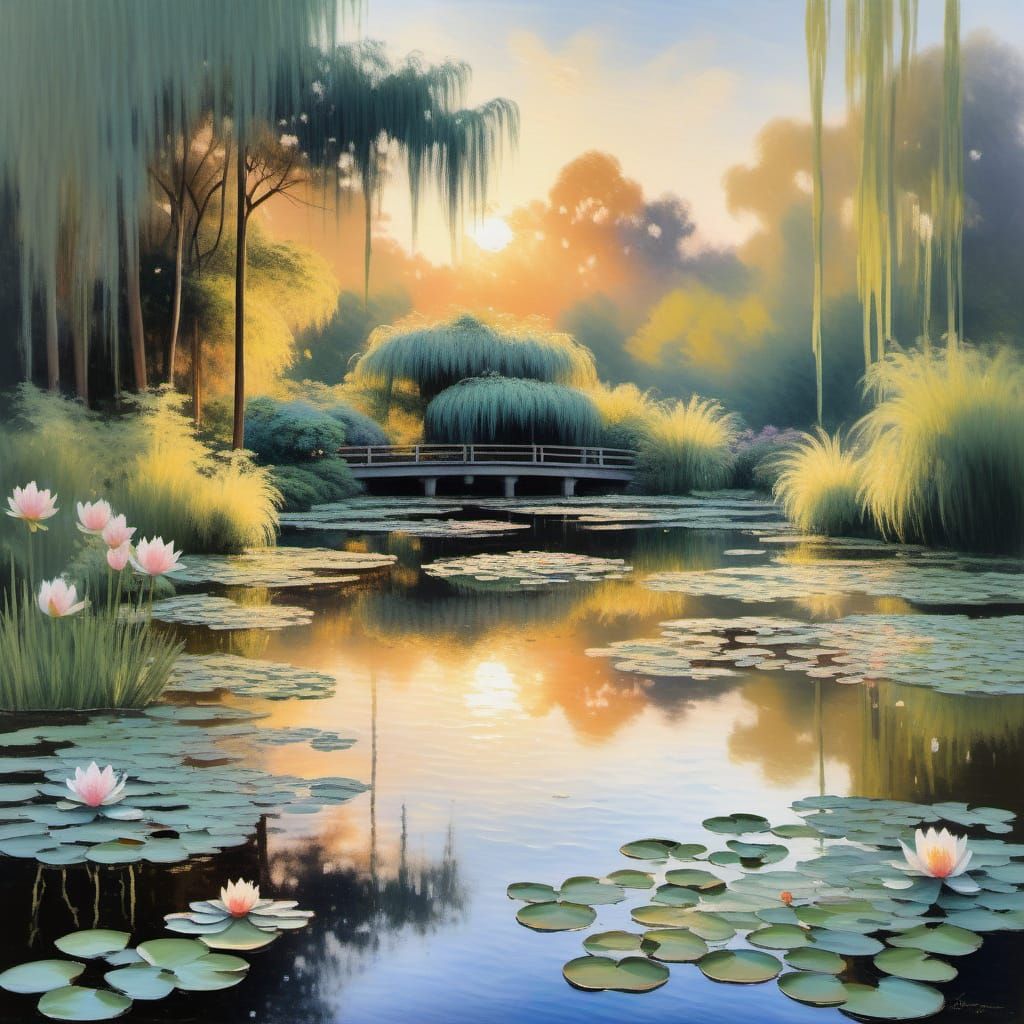 This image depicts a tranquil Japanese garden at sunrise, rendered in a soft, Impressionist style reminiscent of Monet, with delicate water-lily reflections.