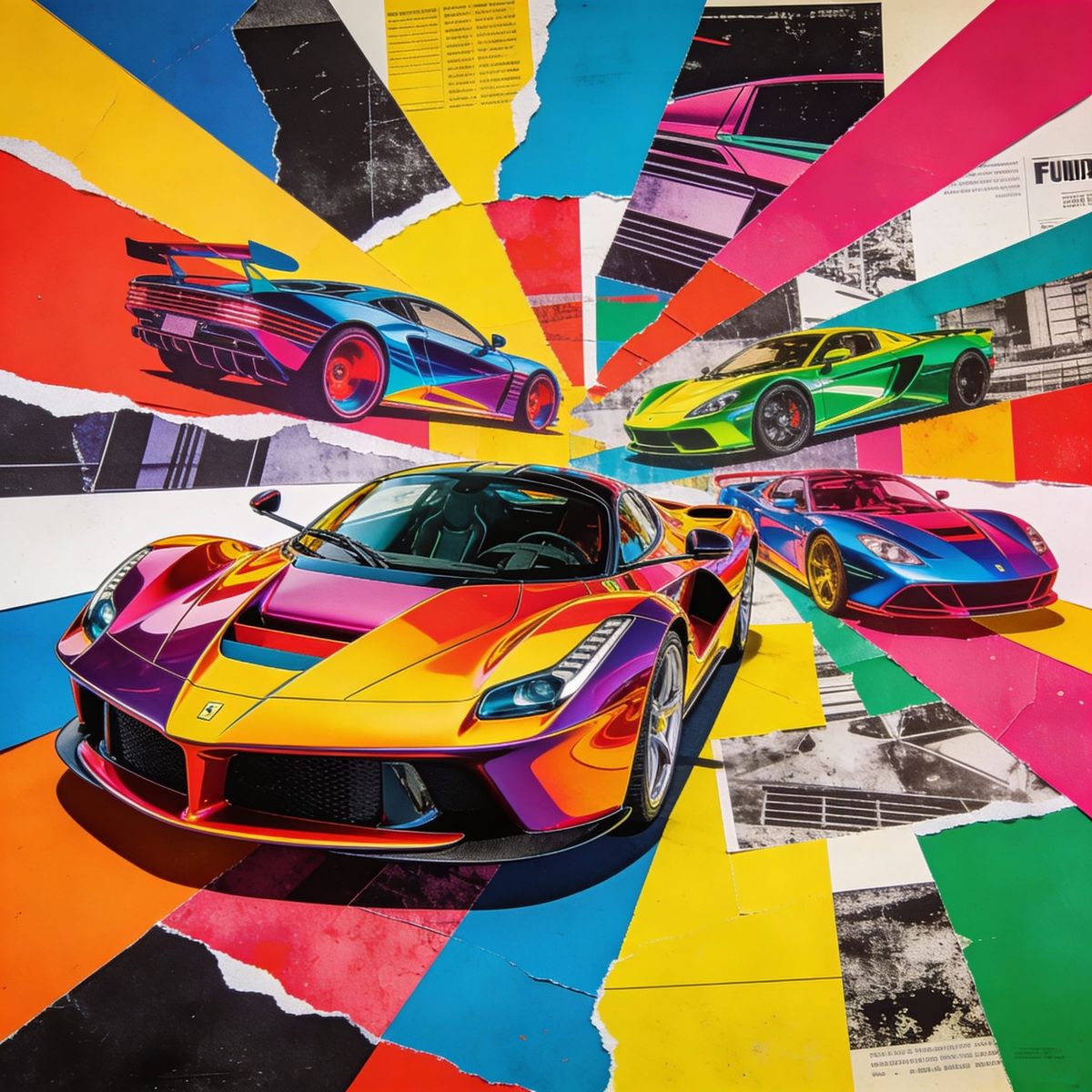 This image showcases overlapping cut-out shapes and mixed-media fragments of futuristic sports cars. Rendered in a vibrant, dynamic collage style with a luminous palette and wide-angle perspective.