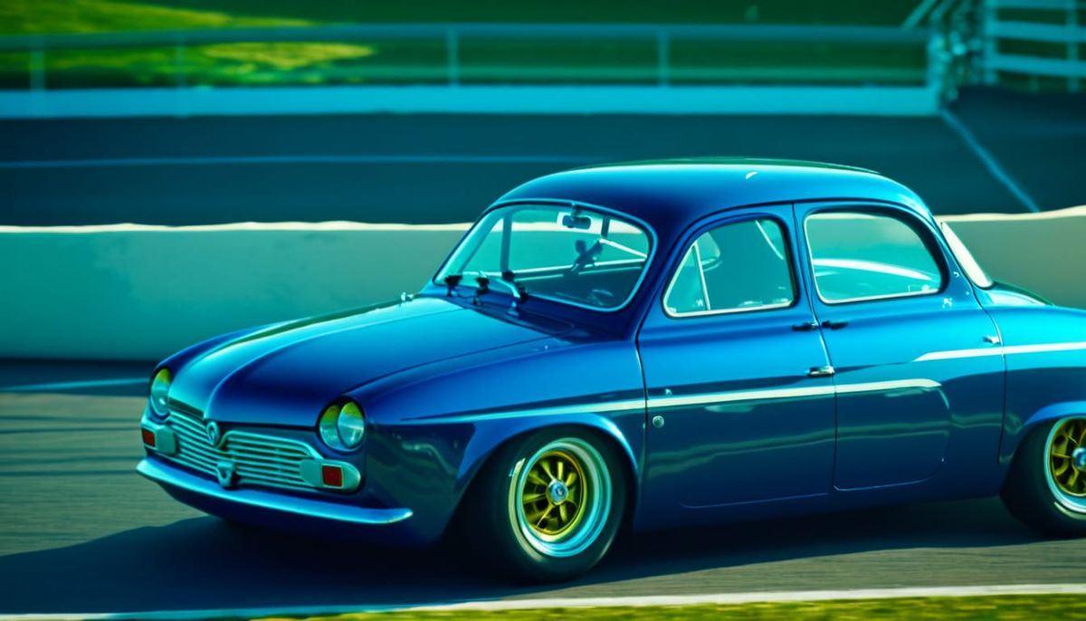This image captures a 1961 Renault Gordini speeding around a racetrack. The automotive photography style emphasizes realistic car reflections, detailed racing wheels, and warm, natural lighting.