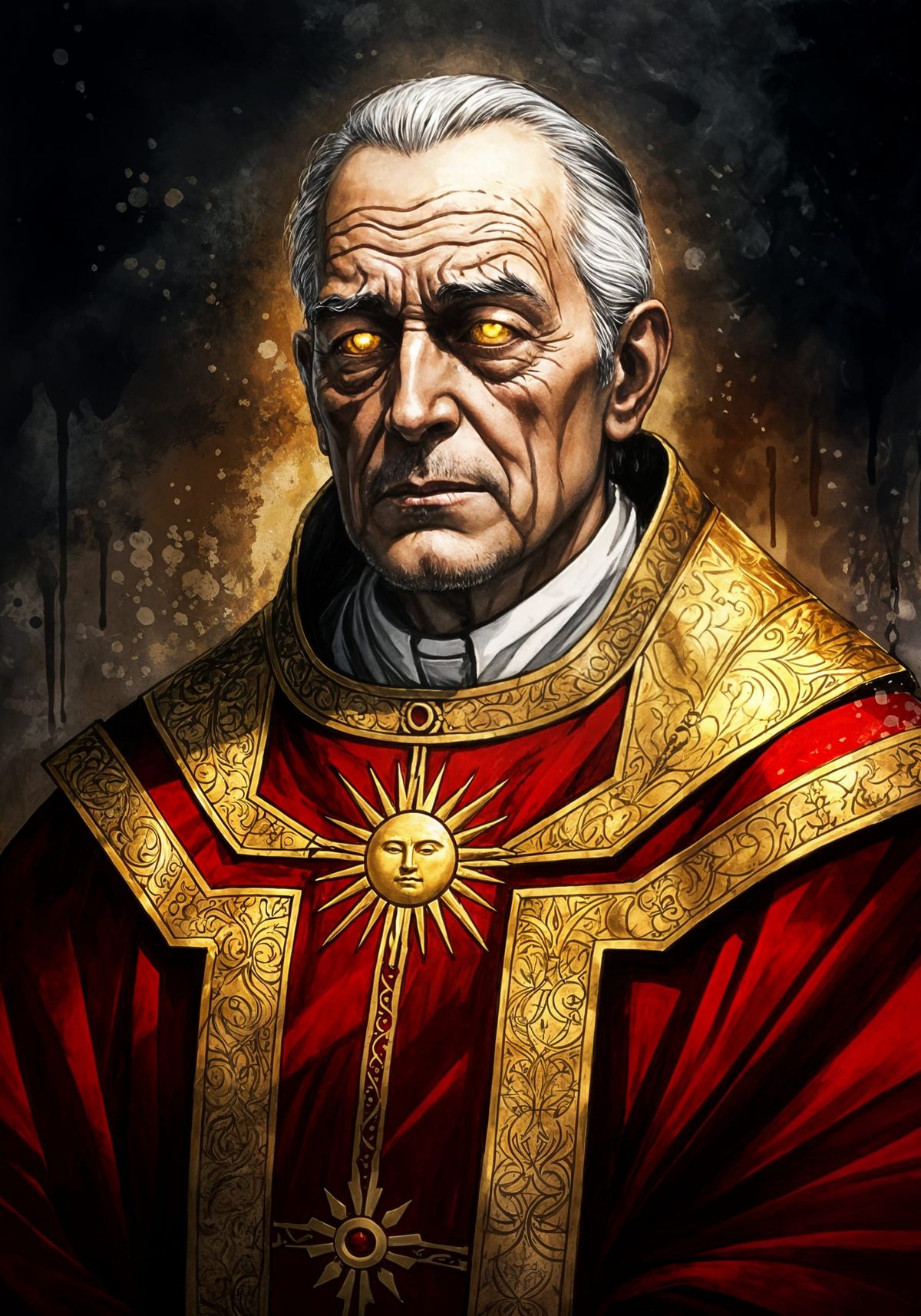 A striking ink drawing of a high priest, dressed in lavish red, gold, and black robes, with a golden sun emblem on a red field, conveying a sense of duty and reverence.